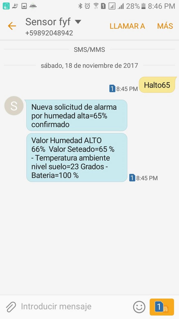 En el siguiente ejemplo se envía un SMS "Halto65" para establecer la cota superior a 65%. A continuación se observa el mensaje de alerta cuando la humedad sobrepasó el valor del 65% establecido.